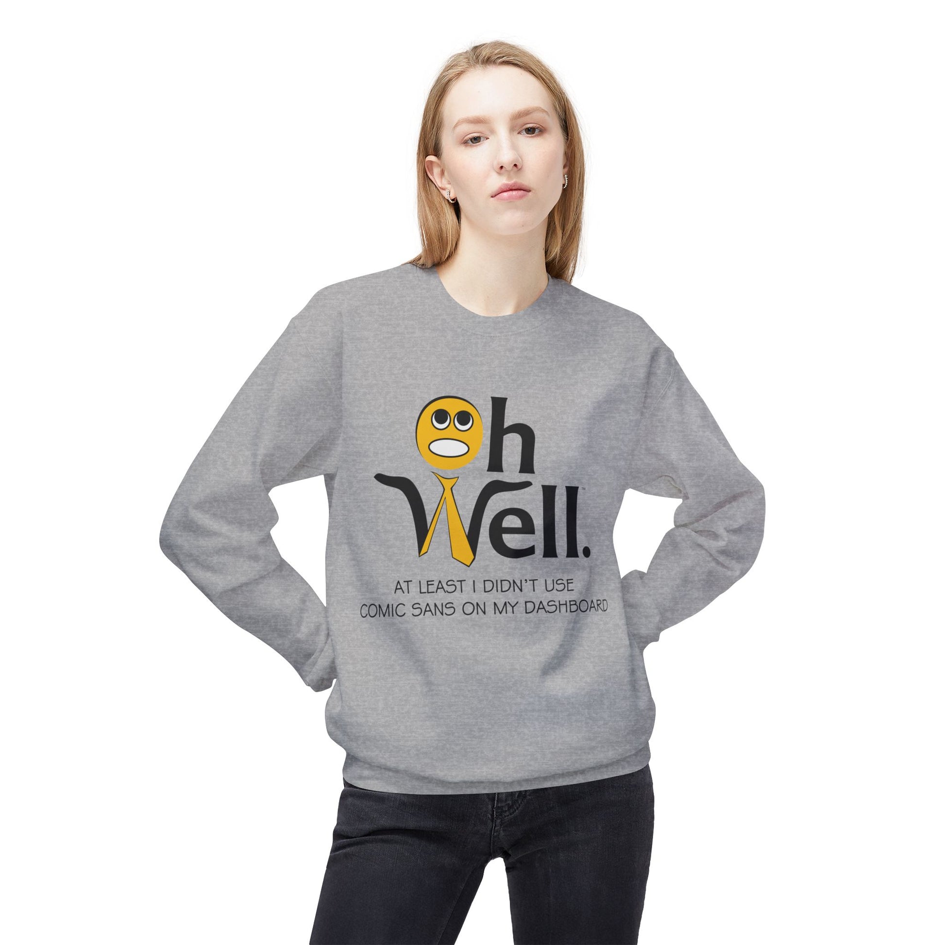 This unisex midweight softstyle fleece crewneck sweatshirt features an 'Oh well' logo with a funny quote 'Oh Well At Least I Didn't Use Comic Sans On My Dashboard '. Perfect for the data enthusiast in your life. Ideal for anyone looking for a comfortable and relaxed fit sweatshirt to wear during casual occasions or lounging at home. Relevant for holidays, casual Fridays, and everyday wear.