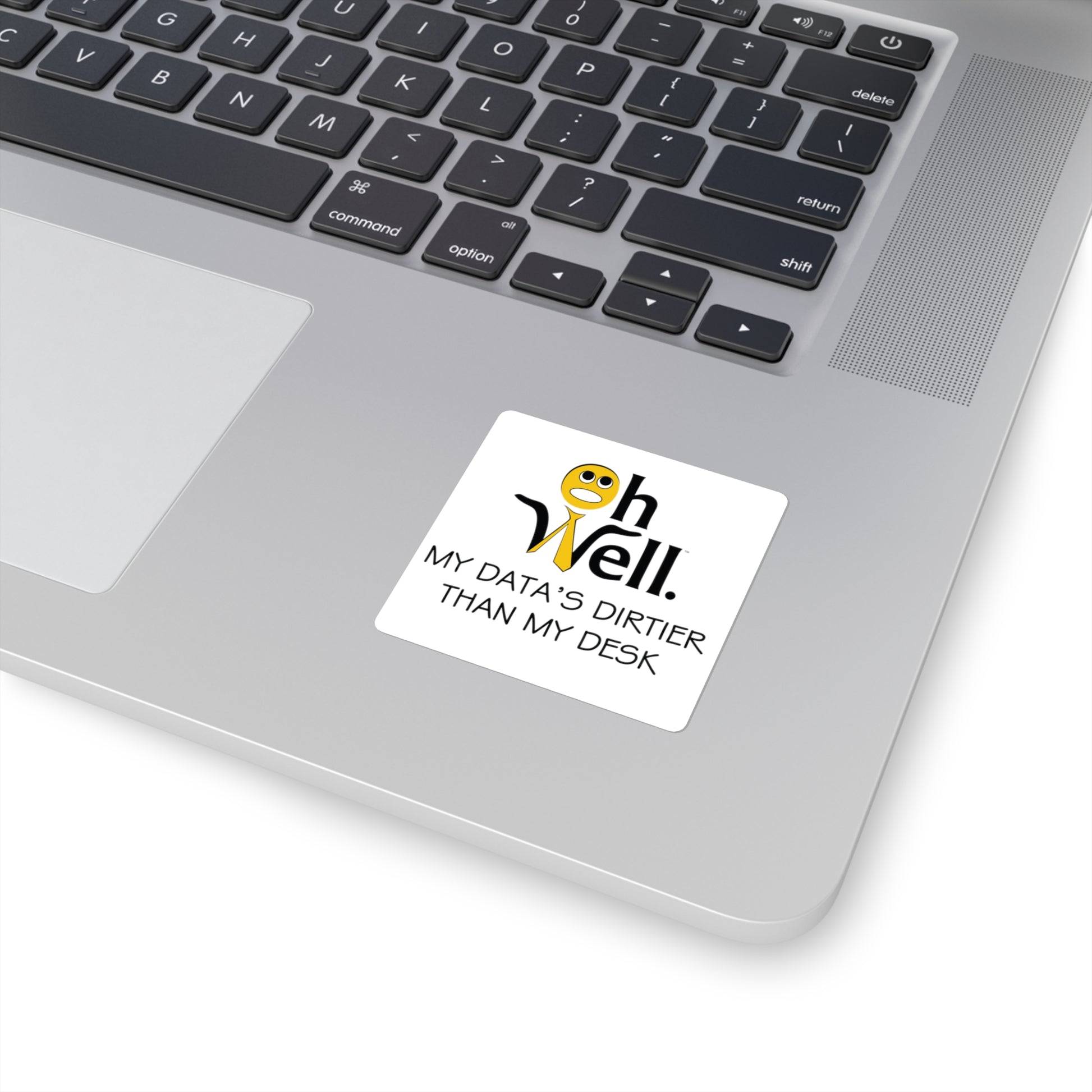 Vibrant square stickers with a funny quote 'Oh Well My Data's Dirtier Than My Desk'. Perfect for the data wrangler in your life who enjoys a bit of humor and chaos in their lives. Great for decorating laptops, notebooks, water bottles, or any indoor surface. Ideal for individuals who appreciate unique and quirky designs. Relevant for birthdays, back to school, or just for adding a touch of fun to everyday items.